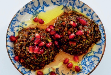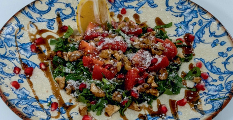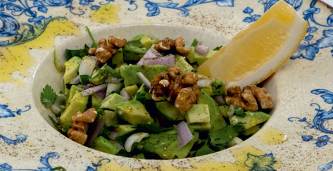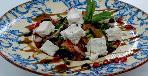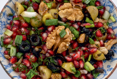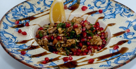 Нарізані кубиками помідори, огірки, перець, цибуля, свіжий гранат та волоські горіхи, подаються з гранатовим соусом та оливковою олією