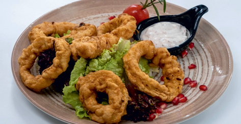 Смажені кальмари з зеленню та соусом таратор