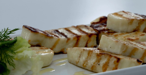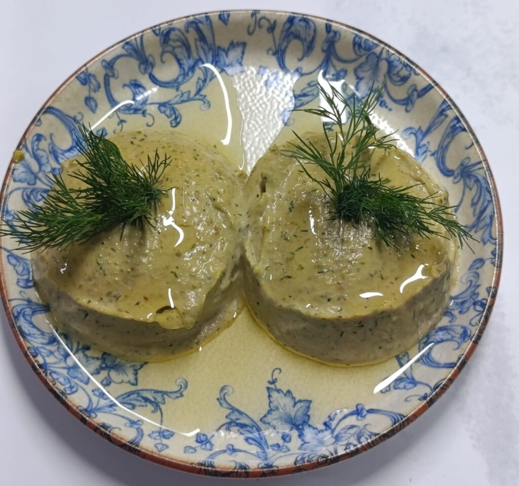 Грильовані та пюре з баклажанів, приготованих з маслом та часником, подаються з козячим сиром та гребінцями