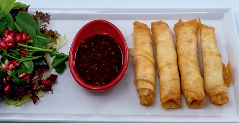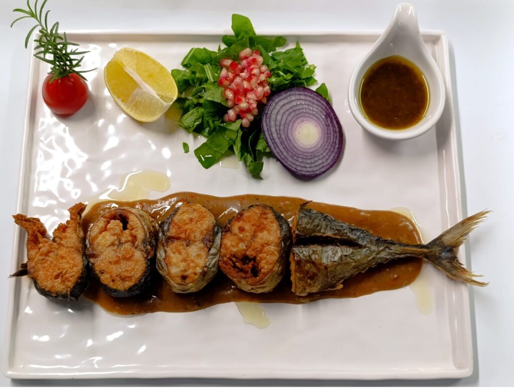 Fried bonito rings, red onion salad and dill pomegranate mustard sauce. (pomegranate syrup, honey, mustard and starch)