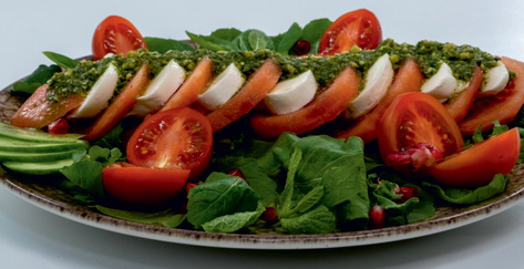 Сир моцарела та помідори, подаються з базиліковим соусом