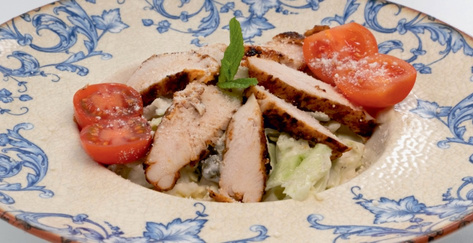 Салат, помідори, сир пармезан та курка-гриль з соусом Цезар