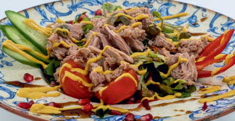 Салат-латук, цибуля, морква, тунець, подається з медово-гірчичним соусом