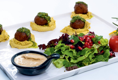 Пюре з нуту, згорнуте в кульки, обсмажене у фритюрі та подане з базиліковим соусом та зеленню
