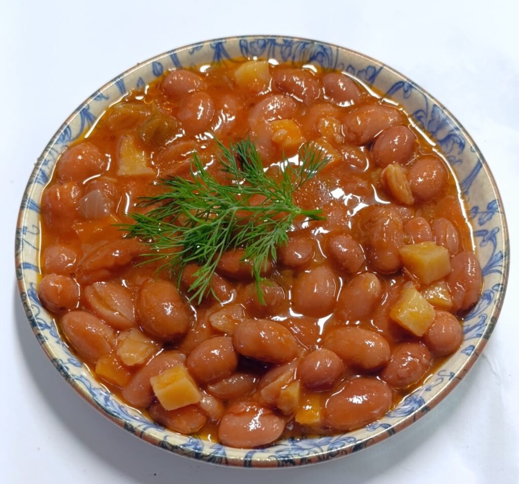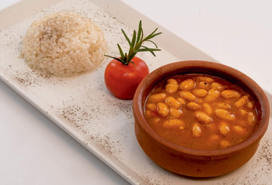 Квасоля, приготована в запіканці, подається з рисом