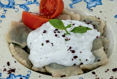 Крихітні домашні мішечки, наповнені м'ясом, зверху политі солоним йогуртом та вершковим соусом