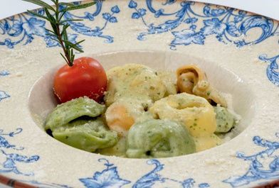 3 кольорові пасти тортелліні, включаючи швейцарський сир менталь, рікотту та грана падано, приготовані з вершковим соусом та посипані пармезаном