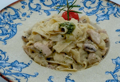 Фетучіні з грибами, шматочками курки, вершками та соусом песто