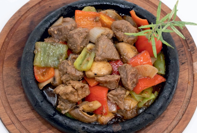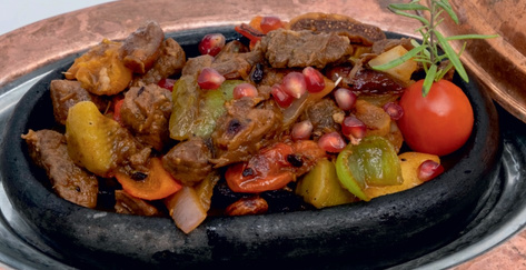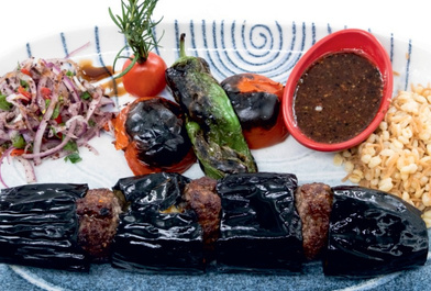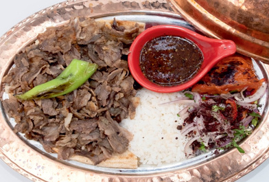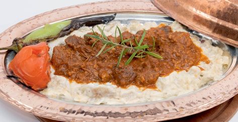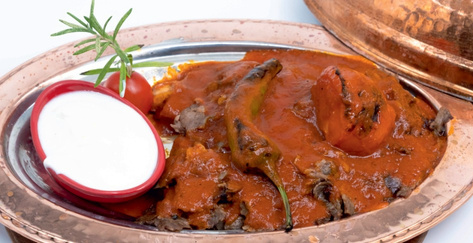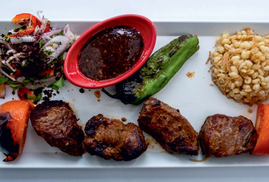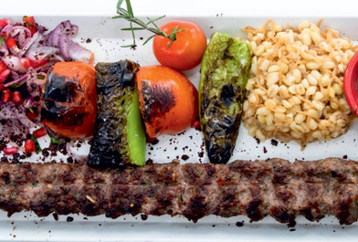 East Anatolian style marinated beef pieces on the skewer served with grilled tomatoes, peppers and onion with