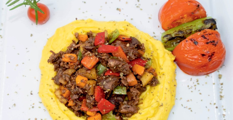 Грильовані та пюре з баклажанів, змішаних з борошном, маслом та сиром чеддер, подаються зі шматочками баранини зверху
