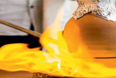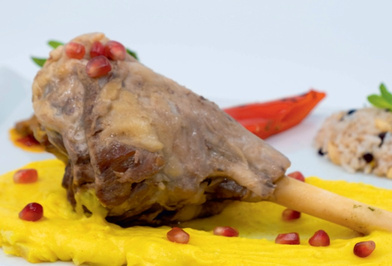 Бараняча гомілка, запечена в тандирі, глазурована свіжим медом зі насіння граната, подається з картопляним пюре з шафраном та апельсином, грильованими овочами та особливим рисом