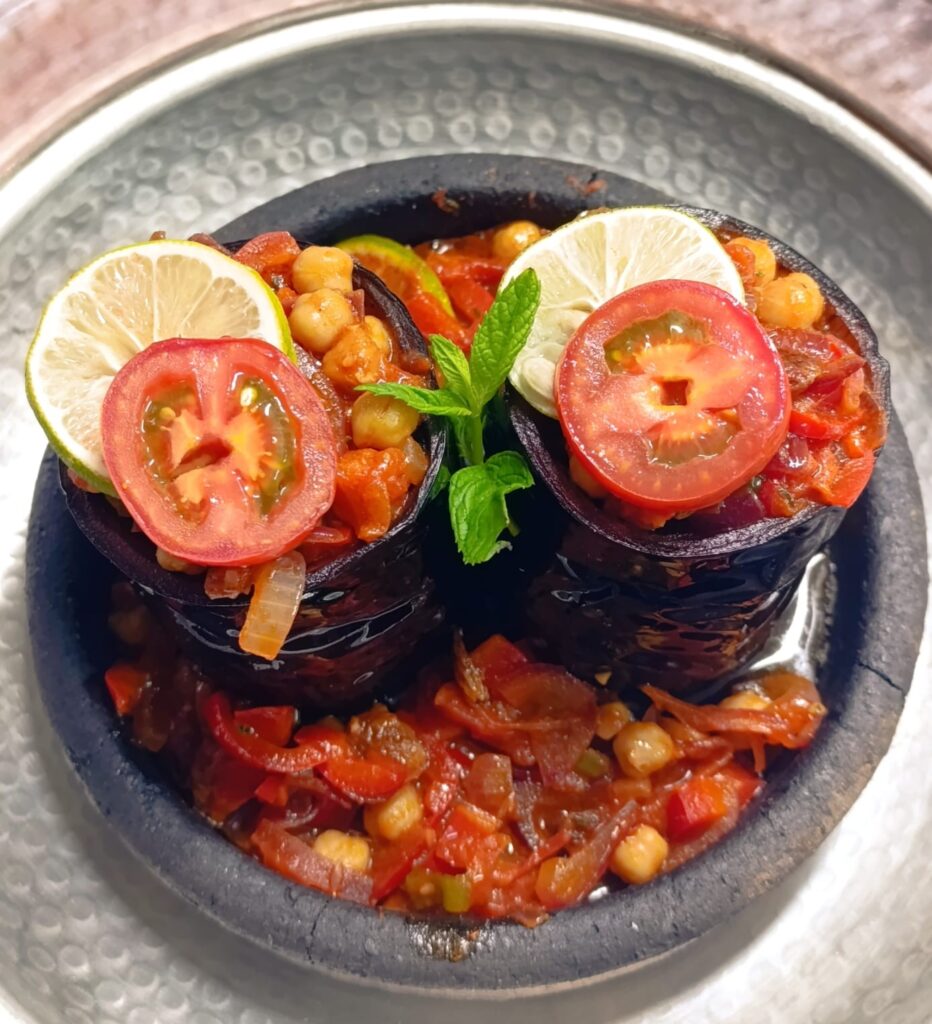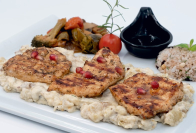 Куряче стегно без кісток, мариноване з корицею, запашним перцем, гвоздикою та кардамоном, глазурується гранатовим сиропом та медом, подається спеціальний рис та пюре з печених баклажанів
