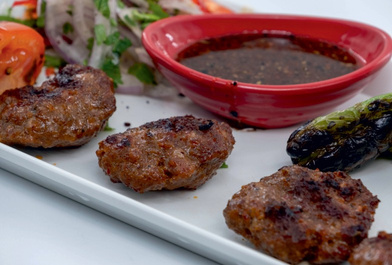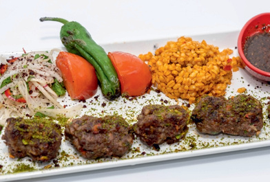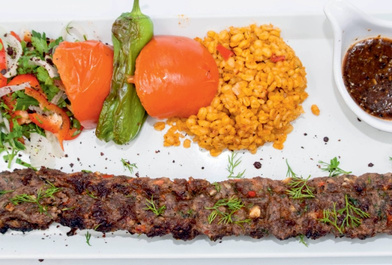 Minced lamb and beef mixed with vegetables on the skewer served with grilled tomatoes, peppers fresh onion with sumac, bulgur pilaf and our special kebab sauce