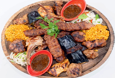 East Anatolian style marinated lamb picces on the skewer served with grilled tomatoes, peppers fresh onion with sumac, bulgur pilaf and our special kebab