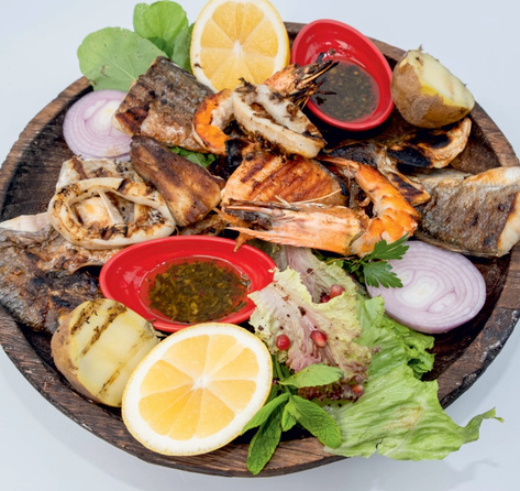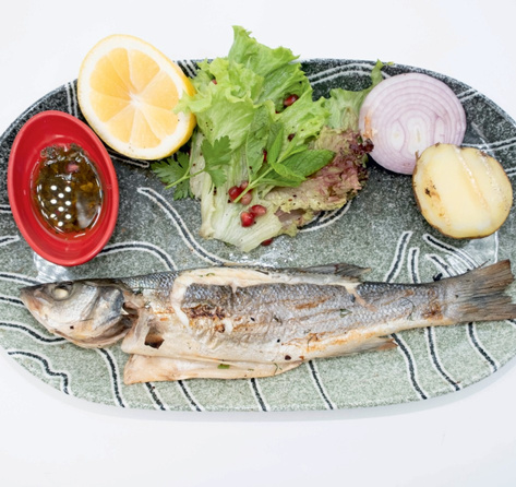 Seabass, Seabream, Salmon, Jumbo Shrimps Grill Calamary, Onion, Greens, Boiled Potato, Lemon and fish sauce