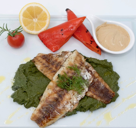 Grilled sea bass fillet marinated with lemon peel, olive oil, salt and pepperis served with orange spinach purce and roasted paprika special sauce as a side dish.