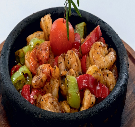 Shrimps cooked in casserole with mushrooms, paprika, tomatoes