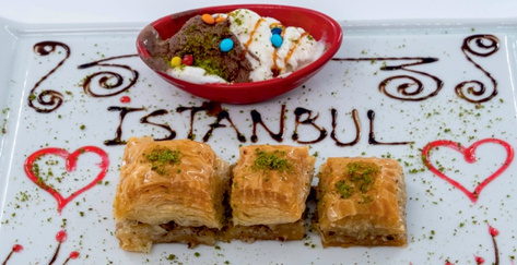 Baklava is one of the most iconic desserts in Turkish and Middle Eastern cuisine, celebrated for its layers of crispy phyllo dough, a rich filling of nuts, and sweet syrup and is served warm with ice cream