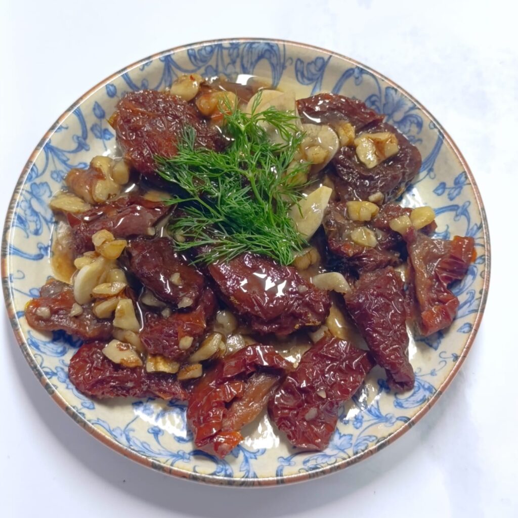 В'ялені помідори, часник, гранатовий соус, оливкова олія з волоськими гребінцями