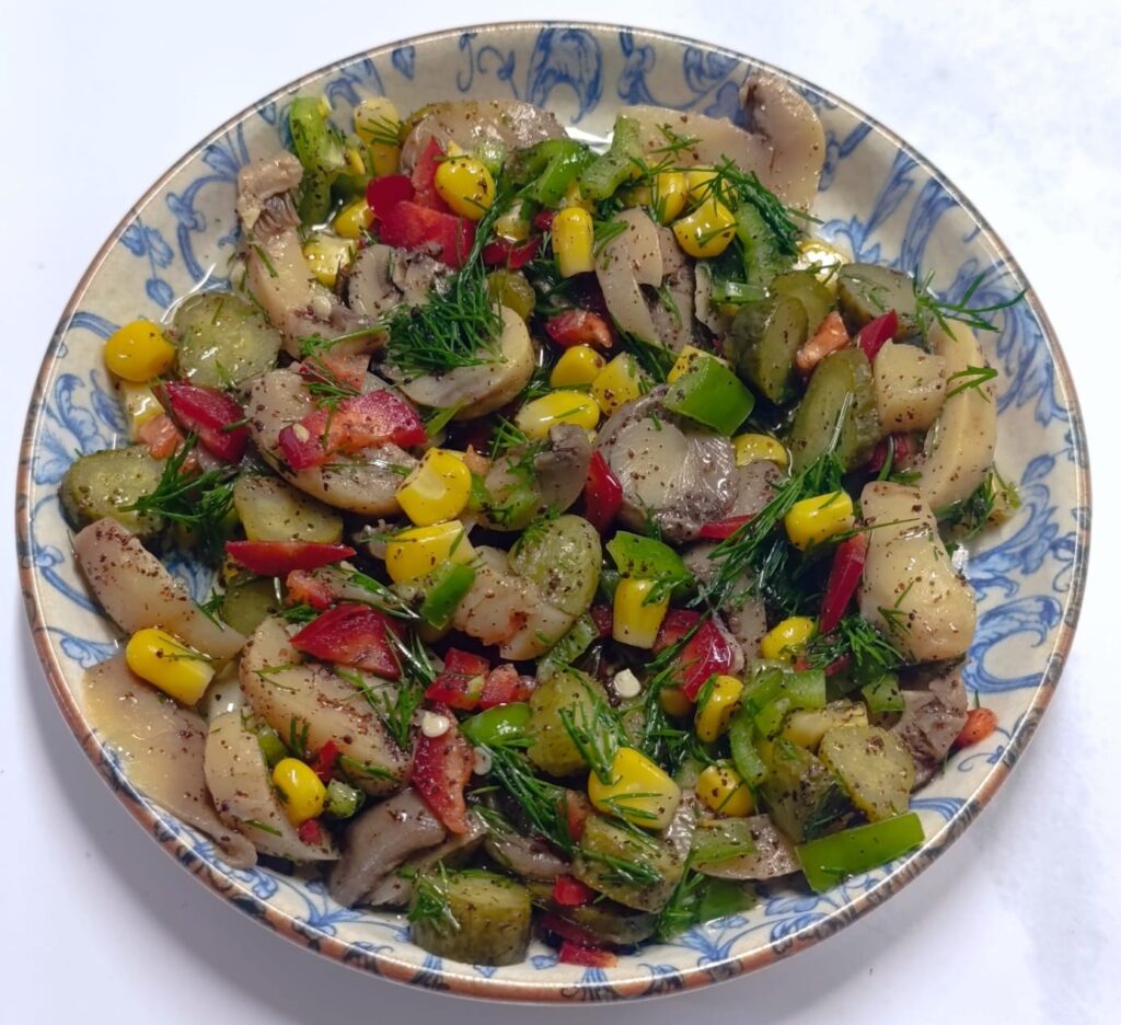 Гриби, мариновані, корнішони, кукурудза, паприка, зелений перець, зелені оливки, петрушка, оливкова олія, сумах, лимонний сік