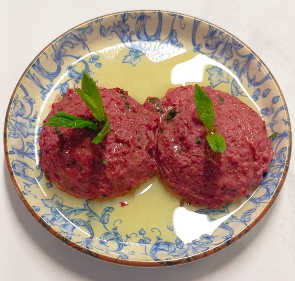 Буряк, нут, тахіні, часник, кмин, лимонний сік, оливкова олія, петрушка та м'ята